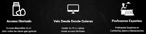 Cursos online que incluyen: Diploma con valor curricular, Lista de proveedores y Recetas comerciales.